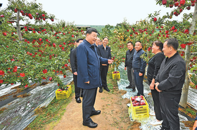 红彤彤的花牛苹果挂满枝头,一派丰收景象。习近平走进果林,了解相关种植、技术和管理情况。他说,乡村振兴关键在产业振兴。经过70多年培育发展,花牛苹果品牌更响亮了。要加强品种保护和培育,优化种植方式,创新营销模式,把这个特色产业做得更大,带动更多群众增收致富。他祝乡亲们的生活像苹果一样红红火火。