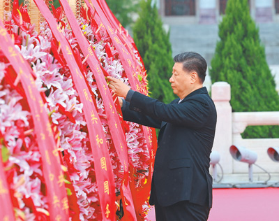 9月30日上午,党和国家领导人习近平、李强、赵乐际、王沪宁、蔡奇、丁薛祥、李希、韩正等来到北京天安门广场,出席烈士纪念日向人民英雄敬献花篮仪式。这是习近平整理花篮上的缎带。