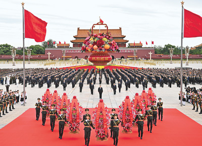 本报北京9月30日电 (记者赵兵)在庆祝中华人民共和国成立75周年之际,烈士纪念日向人民英雄敬献花篮仪式30日上午在北京天安门广场隆重举行。党和国家领导人习近平、李强、赵乐际、王沪宁、蔡奇、丁薛祥、李希、韩正等,同各界代表一起出席仪式。